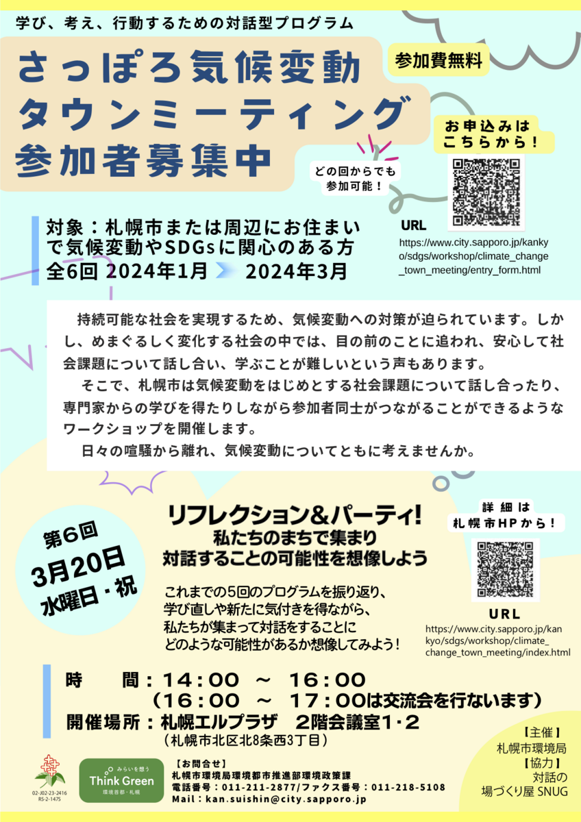 「さっぽろ気候変動タウンミーティング」第6回は「リフレクション&パーティ!私たちのまちで集まり対話することの可能性を想像しよう」です!